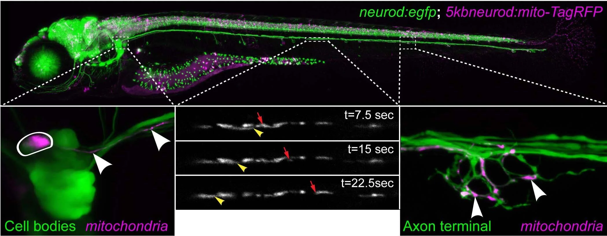We use zebrafish posterior lateral line (pLL) neurons to study intracellular transport in neurons. The cell bodies of these neurons lie in the pLL ganglion just behind the ear (left). Their axons extend through the trunk and branch into axon terminals that innervate sensory organs (right; sensory cells not shown). Using transient transgenesis, we can mark cargo such as mitochondria in single neurons in live larvae to analyze their movement (shown above in magenta; arrowheads point to individual organelles in insets). Middle inset shows individual mitochondria that move over several seconds (arrows).